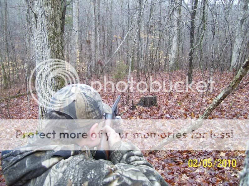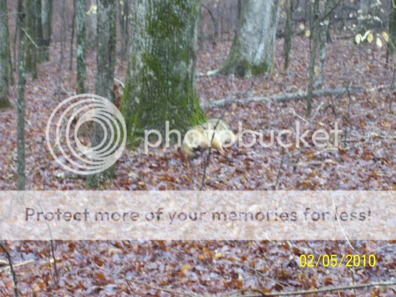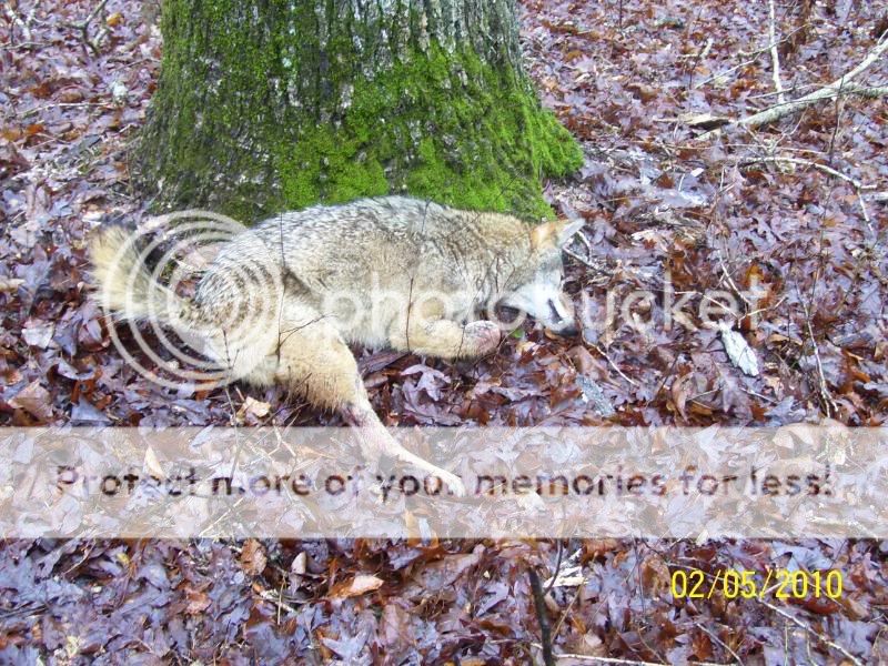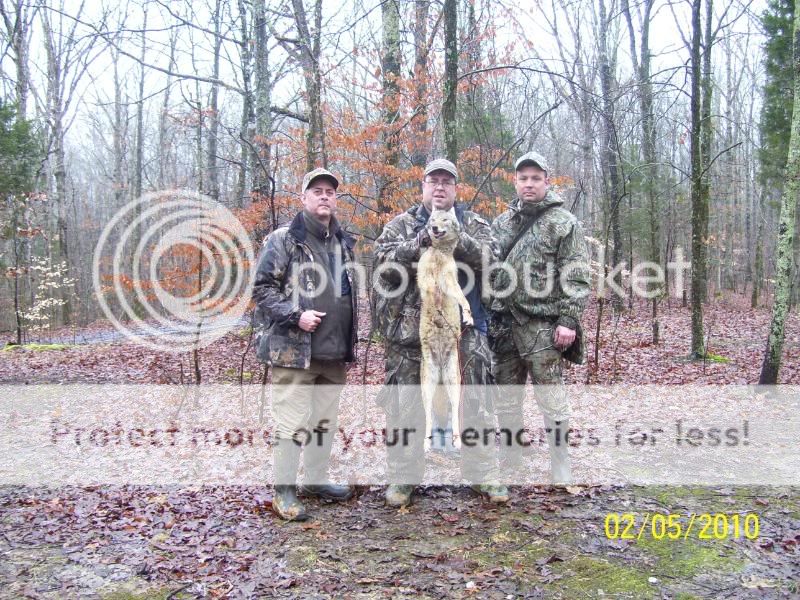 One of the highlights for me though was the hunt I took on Friday (2/5/10) with golfertrout and msmith.  We parked the truck near the entrance to one of those impassable haul roads that run out a ridge.  After getting our gear ready we hiked out the road a couple hundred yards.  We found a good looking spot to set up, checked the wind and decided to give it a try.  We hung the Scorpion in a treee.  Golfertrout with his shotgun set up to the right of the road about 20 yards off the road.  Msmith set up to the left of the road.  I walked up the road a little ways and set up to cover the road in front of us.  We began this first stand of the day at about 9:15 AM.  After just a few minutes of calling I heard, Boom,       Boom, Boom, Boom in rapid succession.  Golfertrout had fur down!!  Here are some pictures . . .