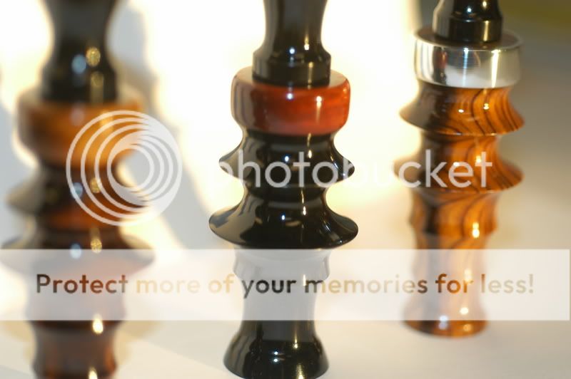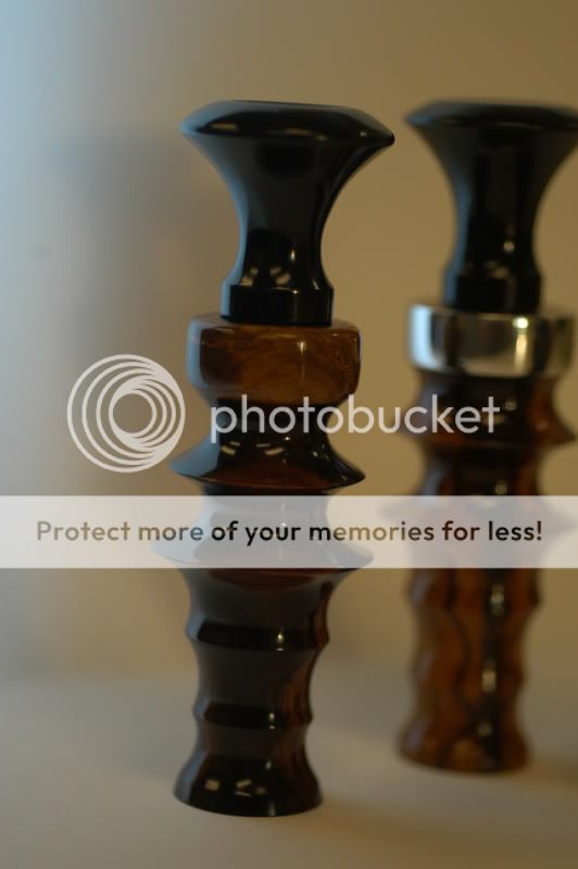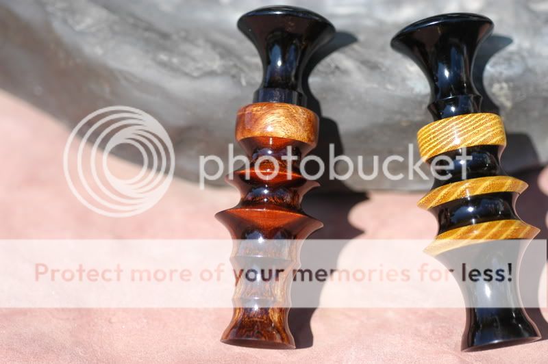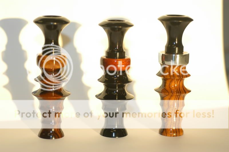 These calls are all spoken for aswell.  The first call on the right is the same as pictured above.  The second call is Gaboon Ebony with a Bloodwood Band.  For whatever reason, while on the lather, this call reminded me of a bat.   :shrug:  And the far right calls is from top to bottom, Gaboon Ebony, Aluminum band, and Desert Ironwood.  This call reminded me of a tiger while on the lather for far more obvious reasons.  These two calls also feature a double o-ring fit.   I chose the Ironwood because I haven't turned any for a while.  One of the great things about this stuff is, you never know what you'll get untill you start turning it.  I've had these two pieces of Ironwood sitting on a bench next to my lathe for over a year now and never knew they looked so good.