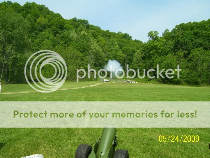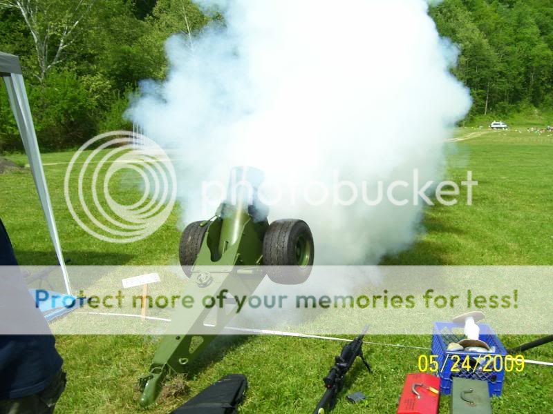 This photo caught this bowling ball cannon in full recoil.  The black bowling ball arched up over head and nearly went out of sight before falling fairly close to the taget cluster two hundred yards down range.  Just awesome!!