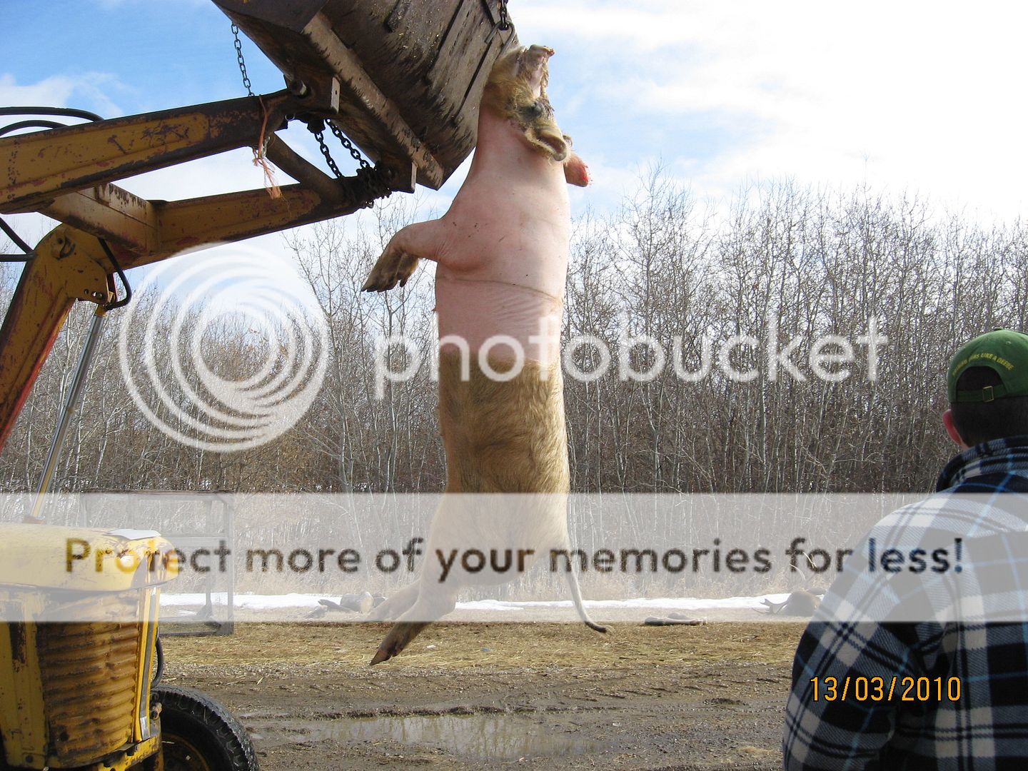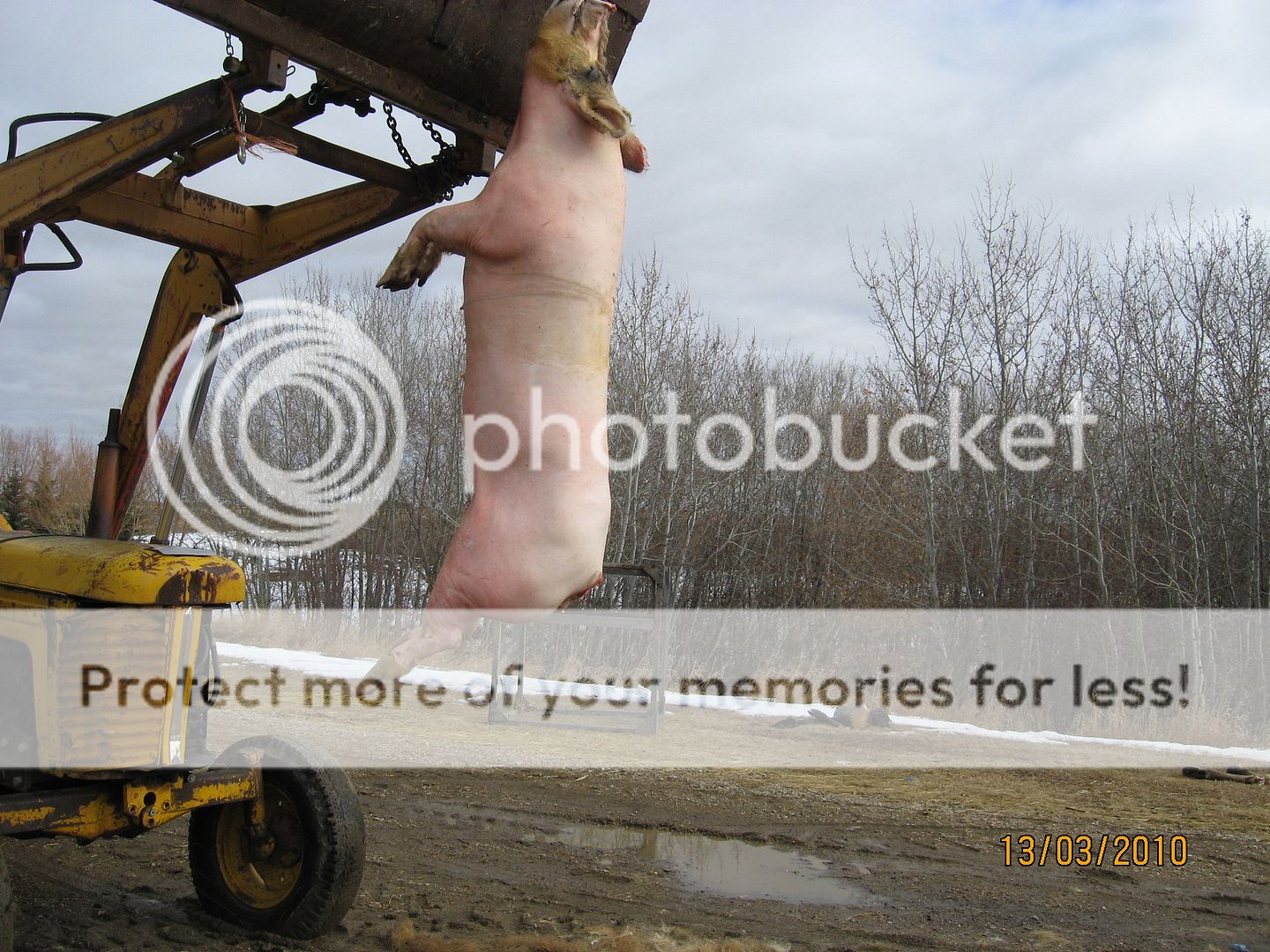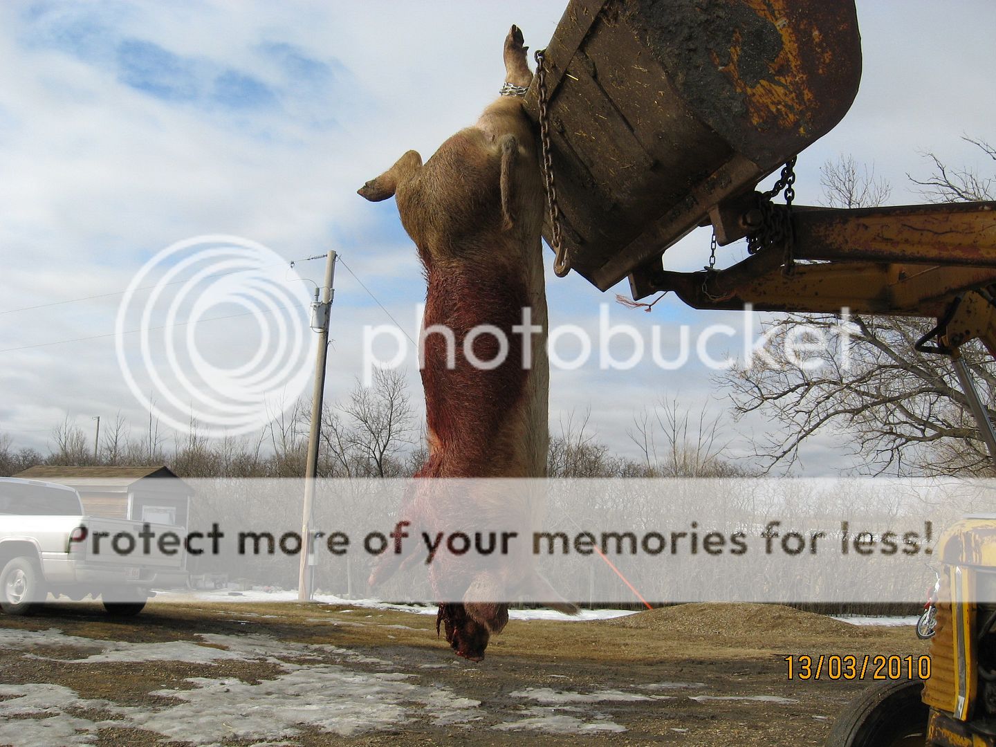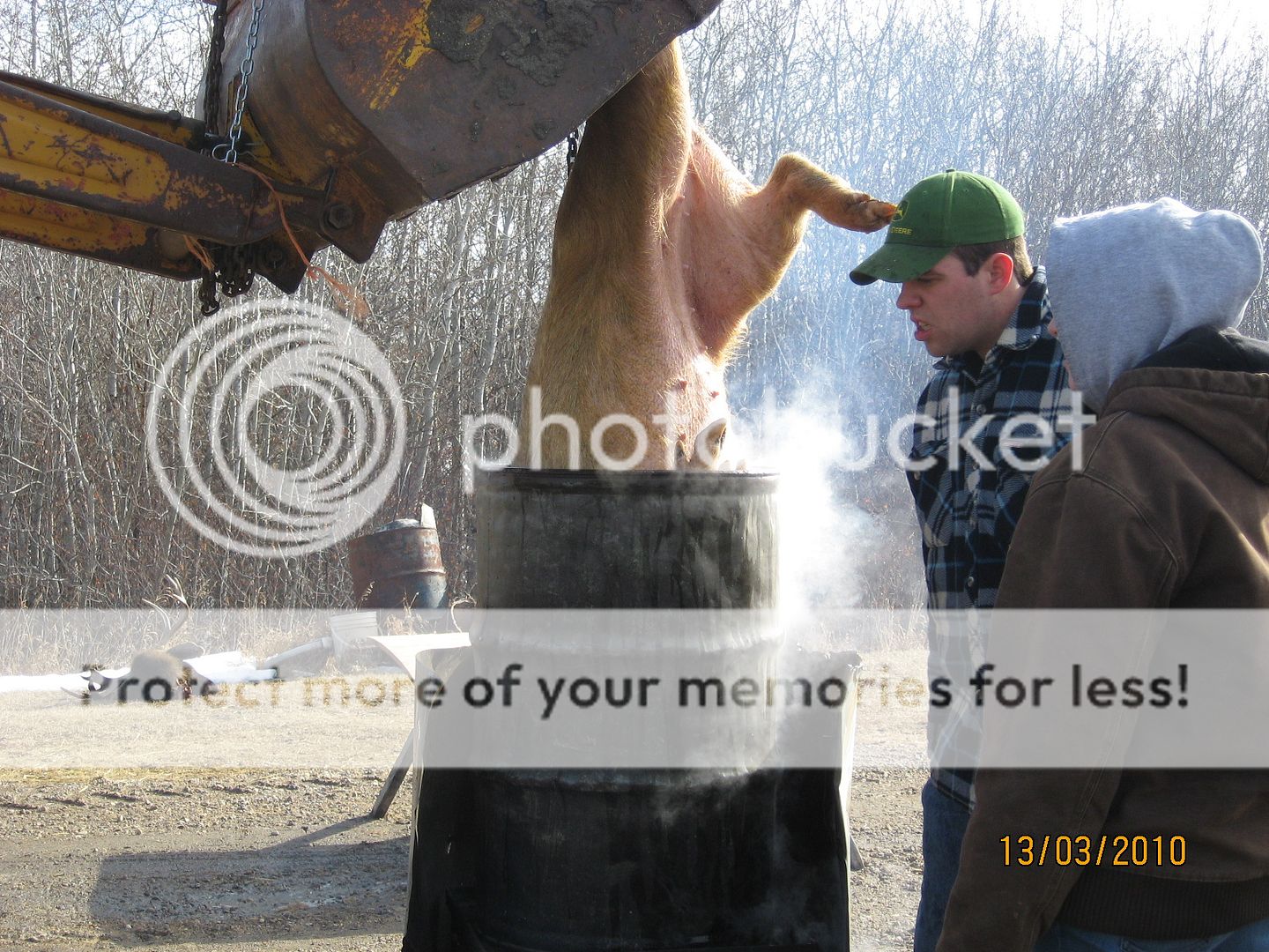 :laf: :laf:  When we were kids we used to help Friends butcher. They would do 3 in one day & that was a lot of work. They didn't have a backhoe to dunk em with either. Just come alongs & a tall tree.  :whew: