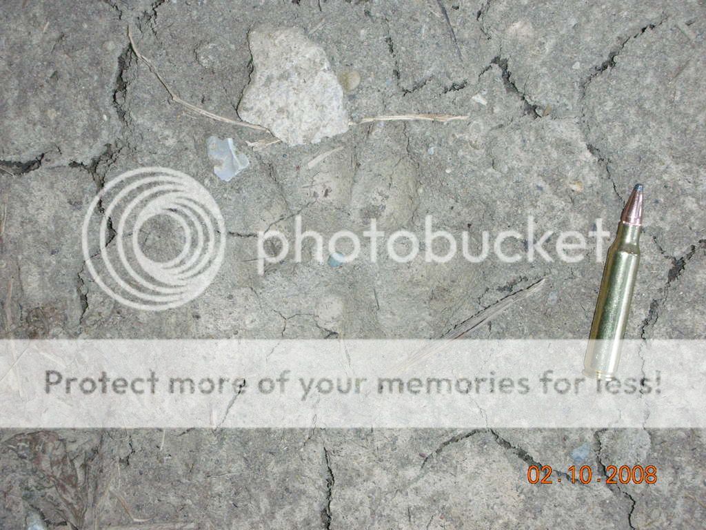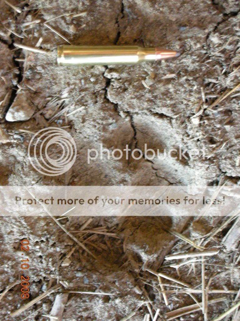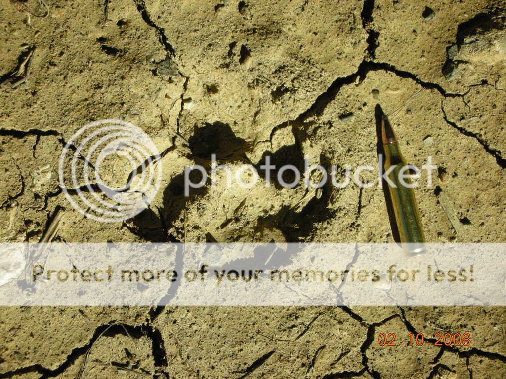 I found these tracks this morning at the entrance to a hay barn that is rarely visited by people. I seen alot of dog and coyote tracks around it also, but these are not coyote and :confused: I dont believe they are a dogs track, did see some smaller ones that looked like cat tracks around. We dont have Mt. lions in this area that I know of  :shrug: but I guess its possible. can any of you guys that are more familiar with tracks ID them ? They are about fist sized and there is a .223 bullet as reference.
