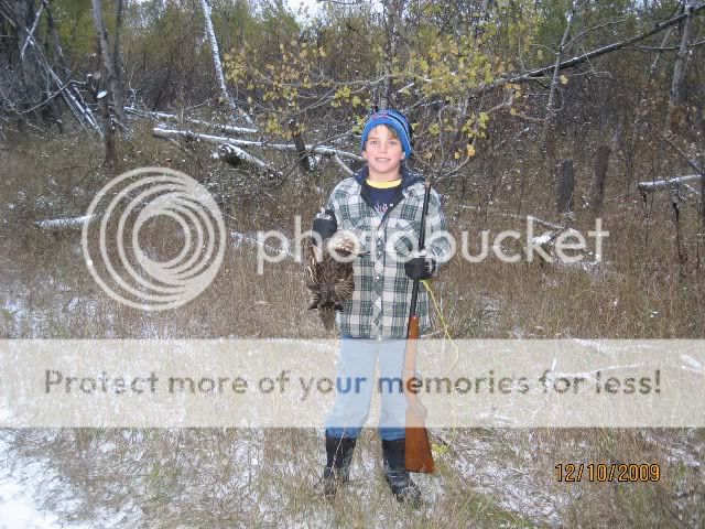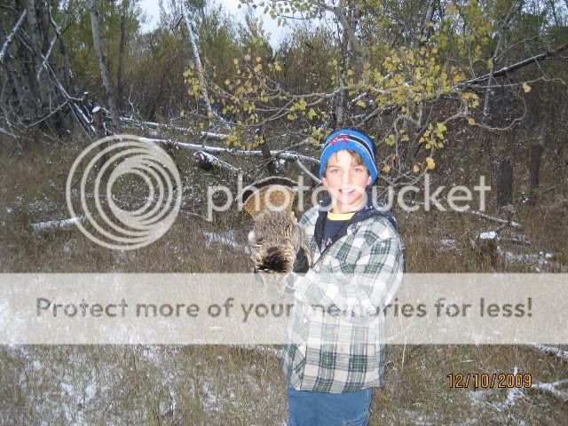 Being Thanksgiving and the boys were home today I decided we would go looking for some fresh air.  The boys suggested chicken hunting which around me means Ruffies.  Drove a mile west and 1 1/2 north, parked the truck and took off walking.  Bob being older and Knowing more took off by himself and Don and I headed west.  Some really ignorant person forgot the camera in the truck  :doh2:.  Following my boy who never seems to pay any attention to whats happening at the time I got surprised many times.  First he finds a path in thick stuff[for here] and said "I could catch a coyote here".  we saw a mule deer doe and many tracks.  All of a sudden the little guy stops and cocks his head to the side and then says "I hear one over there".  He goes in some taller poplars and a Ruffie flys from branch to branch above and in front of us.  One shot later I had one happy boy on my hands.