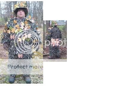 Got the bottoms to my camo today. I went out in the backyard and just sat down by a couple different trees and let my wife take pictures from about 10 yards. It looks to me like I might be better off without the leaves except for maybe on the top of the shoulders and my hat. I think that would help break up the human outline. Other than that I think the other leaves should be removed. Let's see what y'all think. In all fairness the suit is very quiet, but adding the leaves makes considerably more noise and just adds something else the gun, calls, etc. could snag on or brush up against to keen ears.