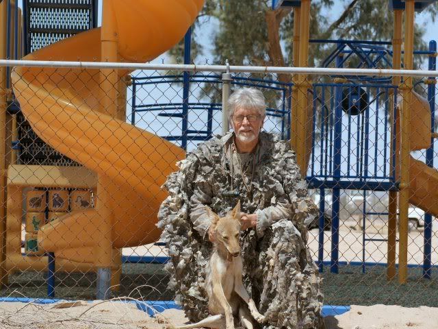 Scott Francom and I drove out to the desert, called in a coyote that Scott shot then drove to a small rural town and posed with the coyote outside of the playground of an elementary school. You can see that I did not actually enter the playground. The fence borders pristine desert and is outside city limits.