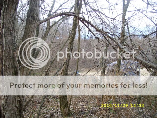 I went out yesterday to kick some brush and try for a cottontail when I cam upon this set up right on the property line the edge of the trees is the line.