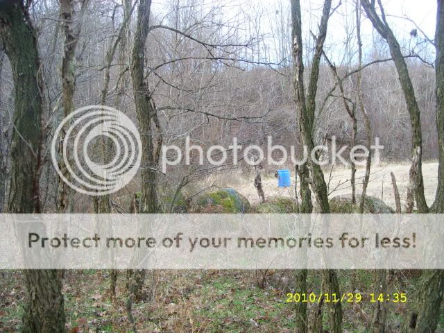 The blue barrel is a feeder,so I get this Idea If the neighbor boy and his buddies can set up on the line why can't I use their feeder to my advantage.I did not give him permission to retrieve a dead deer from my property cause he never came to me and asked.However I am one step ahead of this young man and his buddies I did ask the dad that owns the property last summer if I could retrieve my deer if it runs over on their land and he gave me permission.I don't need  any ground blind I will stand or sit about 10 yards from his blind and I will thank them for the use of the feeder