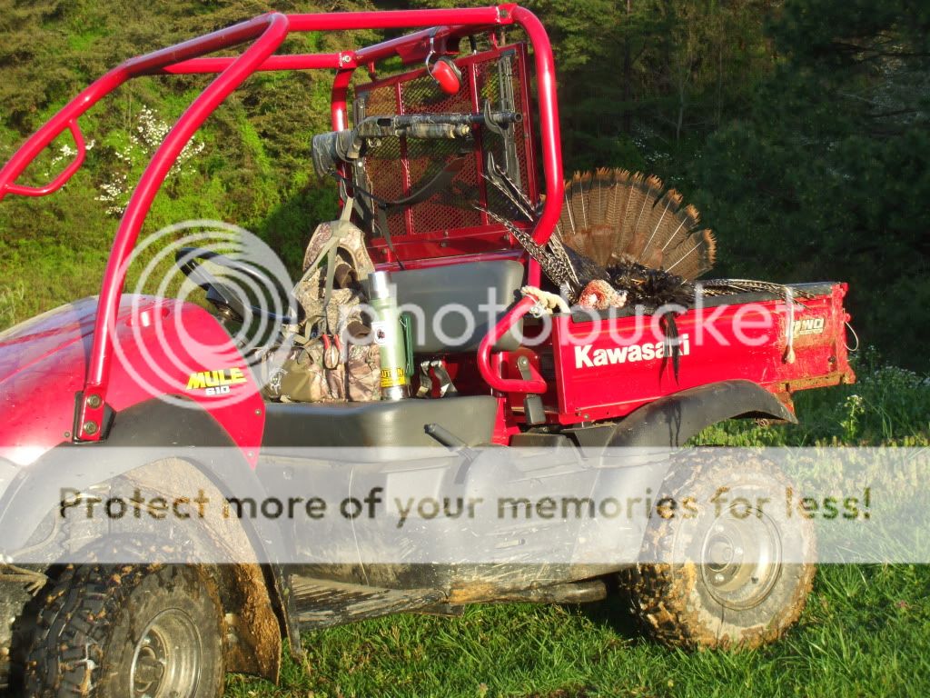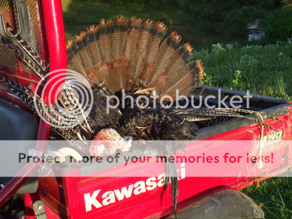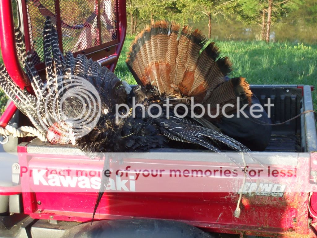 The alarm went off at 5:30 am saturday morning. I looked out the window and the rain had stopped but the wind was blowing hard,just about hard enough to put me back to sleep. I thought what the heck I'll get up and give it a try. Seeing how I failed to put my hunting stuff out the night before I was trying to hurry as fast as I could and not forget anything [COFFEE] you know the important stuff like gun,shells blind. Finally got the mule loaded and headed out [ nice when you don't have to go far] . I tryed to crow call for a response but all I could hear was the wind. Time for plan B -go to a place I've killed turkeys before and see what happens. Find THE SPOT set out decoys, get blind pull out of bag, must have grab it wrong it unfolded in my face knocking of hat and glasses [ its dark] try not to step on glasses looking for flashlight. Finally wresel blind into tree line and get set up WHEW. At 6:45am I could see my front sight [ found glasses] and did a fly down call . I then did a few gobbles with a excited hen about every 2 3 minutes. at 7:15 this guy struts in and attacks my jake decoy and tried to mount him. I had to stop laughing and protect my decoy so I shot him. On my farm scale he was 20lbs 4 oz with a 10 inch beard and 2 7/8's spurs. A good 2 year old bird. Sorry about the pic's a WET bird is hard to get a good pic.  Thanks  Steve