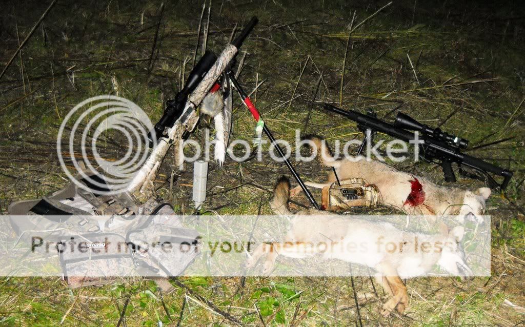 Yote Yoda and I went out and did a little shooting this afternoon at my soninlaw's farm in Owen County. My Prairie Panther and his JP AR-15 were shooting to our satisfaction, and we still had a good deal of time left, so we decided to drive on up into another new farm in northern Ky. to take a looksee and maybe make a stand if we had time.  The wind was perfect for this particular place, but we only had time for one good stand so we picked out the best looking setup we could find with this particular wind.  Using a combination of his Firestorm and my Cronk Assassin mouth call, we started out with a couple of interrogation howls on the mouth call, followed up by a howl or two on the Firestorm.  The coyotes really lit up a woods about 400 yds from the place we were perched.  We gave it a few minutes and then gave them a couple of challenge howls, waited a couple of minutes more, and went into one of Yote Yoda's favorites, Coyote & rabbit. It didn't take a minute before I spotted 7 coyotes coming, real committed, with the big male and mama leading the race, 5 pups in tow.  Put the Sceery squeaker on the Prairie Panther into use, stopping the female for a 80 yd chip shot with the Prairie Panther.  The big male cut hard left into some thick briars and weeds, with one of the pups not far behind. Yote Yoda made a really good running shot, rolling a nice young male at about 130 yds.  None of them were having any of the come back and check on mama and brother deal, so we gathered up the dead ones and slipped out right at dark. All in all, it was a good afternoon in all ways.  Here is a picture of the two coyotes and some of our equipment.