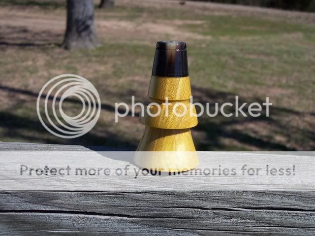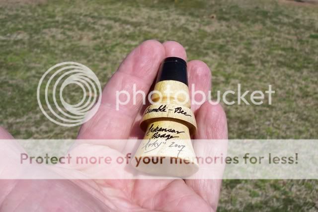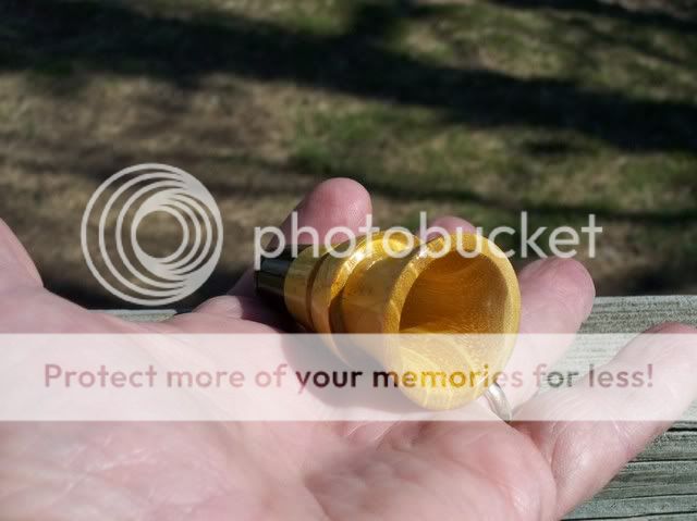 I thought this morning I would try to make something special....so I have spent several hours making something I think was fun....I was inspired by some of the work with cow horn I have been seeing (Hi Brandon)....so I thought I would try to "Marry" some cow horn and some of my Osage....I ended up with a "Bumble-Bee"...it is a piece of blonde Osage, in an enclosed reed configuration.....mated to a cow horn mouth piece...I spent a lot of time on this call.....little thing such as under cutting the band below the lanyard groove.......VERY thinly ( to be this thin, it MUST be centered almost perfectly)....and I was so lucky, it has an almost seamless fit between the horn and wood.....The horn contains a JC reed sleeve and reed...all is turned and finished/sealed, inside and out.....signed and dated...I thought ya'll might like to see it....if you are interested, lemme know....if not, I will be most happy to keep it myself.......