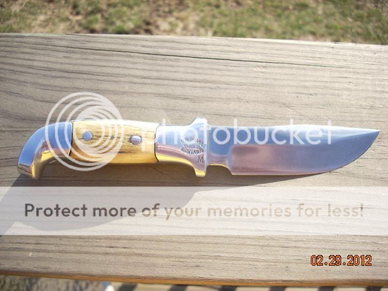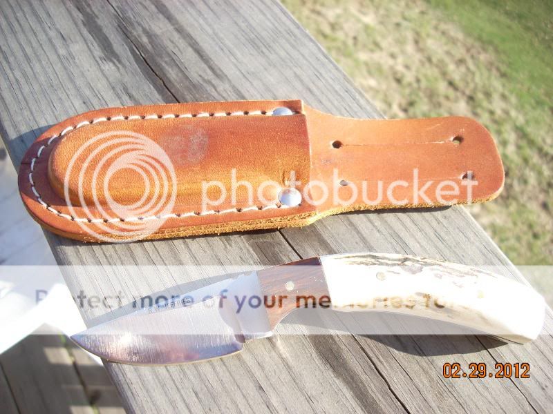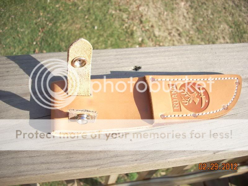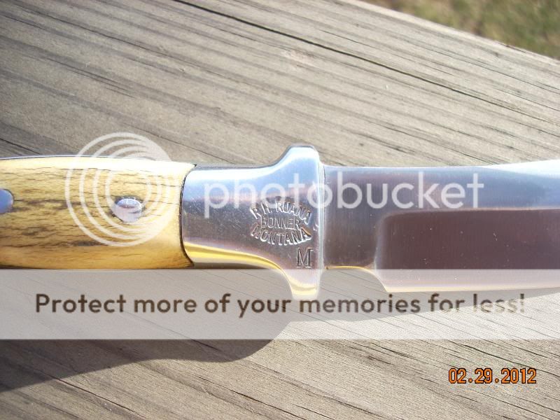 I have an interesting story to go with the Ruana.  I inherited this knife from my step father.  I had it on my work desk in the basement to use as a letter opener.  It was really rough looking and had some light rust on the blade.  I had no idea what I had.  One day recently the President of our gun club was at the house to sign some insurance papers for the gun club.  He saw the knife on the desk and said,  "Oh my gosh, that looks like a Ruana!"  He then informed me that the Ruana knives are very collectable.  I googled "Ruana" and found several of these knives going on ebay for $300 and $400!  I finally found the Ruana web site.  There I learned that I could return the knife to them for refurbishing and to get a new sheath for the knife.  There was no sheath with it when I got it.  So I sent it to Ruana and you can see the results in the above photos.  Cost me $110.00.  They did a great job on the knife and it looks like new now.  They told my that this knife was made by Rudy Ruana probably in the early to mid 70s.  That is about the time my Mom and Stepdad did an extended Western sightseeing trip.  I assume my stepdad bought this knife when they were on this trip??  Pretty neat, huh!  If it wasn't for my friend recognizing the Ruana, it would still be a very valuable letter opener.