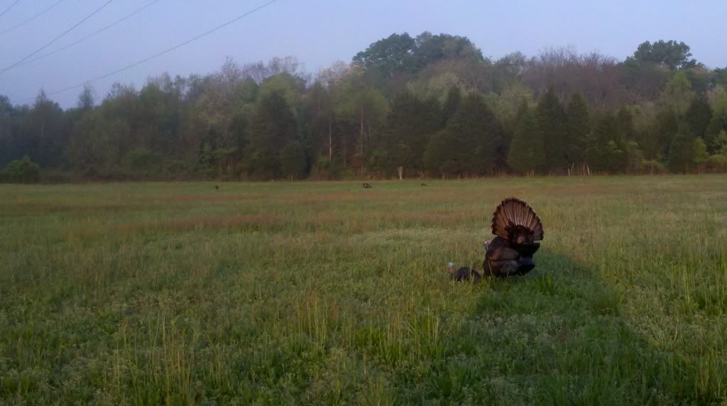 Rolled out this morning with all my best friend's (By myself) to see if my bird's went to sleep where I left them yesterday...Low and behold they did! Saw alot of turkey's,  Killed this one but was holding out for a real pig but he wasnt having anything to do with my calls or set-up but this one stayed within range for 30 minutes or so strutting around so finaly I couldnt take it anymore and he was starting venture out of the Bang-Flop zone so I Bang-Floped him...9"beard and 1" spur's. After which the bird's never left the field so that meant I couldnt leave the blind without educating the rest so I sat there from 6:55 when I shot mine to 9:30 waiting on the rest to leave the field, In that time I had 7 definite shooter's walk into my decoy's at various time's. In all I saw 13 Gobbler's and an untold amount of hen's.