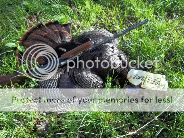 Just stepped into the timber this morning and heard a gobbler.  Quick setup and 20 minutes of light calling brought him into veiw. He hung up at about 45 yds. and after a good look decided he didn't like it.   Longer shot than I care to take but he was leaving.  Winchester 6's and the undertaker choke got the job done!!  Nice bird, 24lbs. , 10.5 inch beard, 1 1/8 & 1 1/16 spurs. :yoyo: