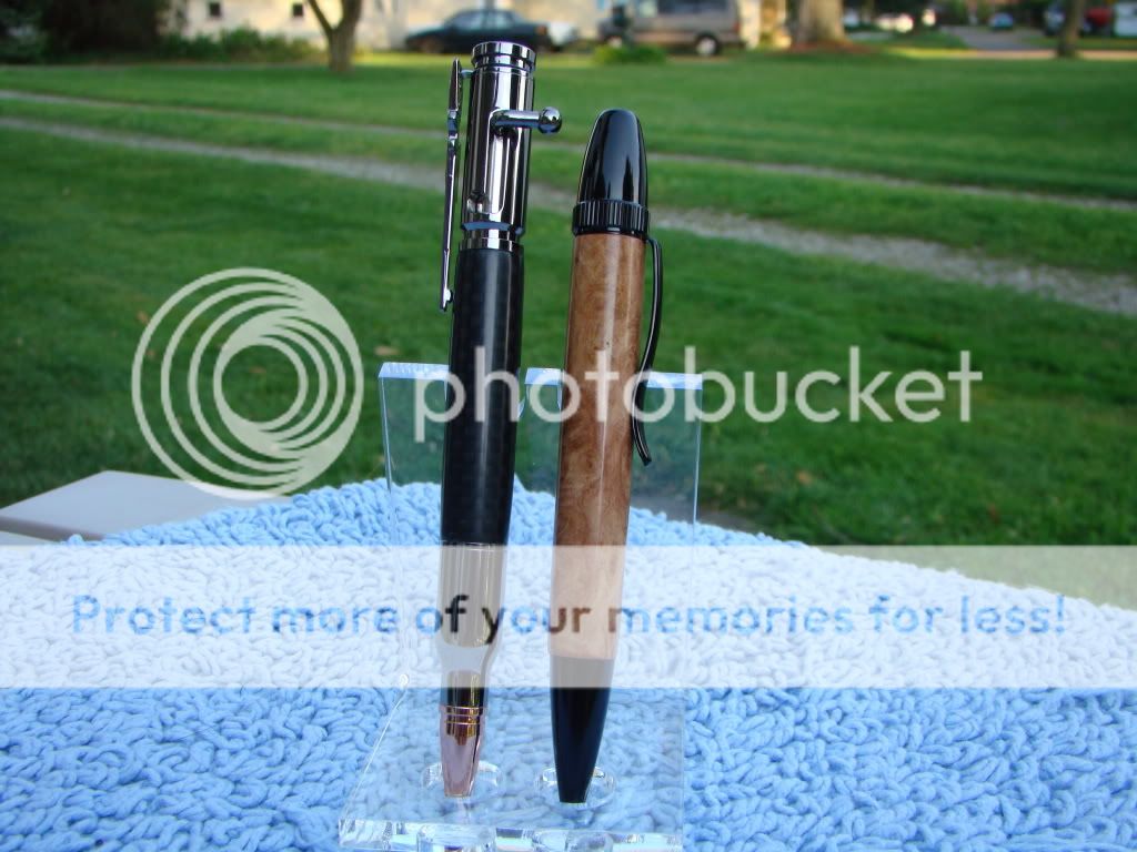Left is another bolt pen with Carbon Fiber/Gun Metal encased in clear acrylic. Right is Red mallee Burl on a Black Atlas pen.