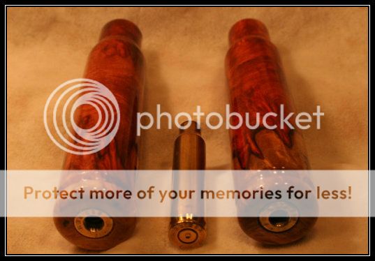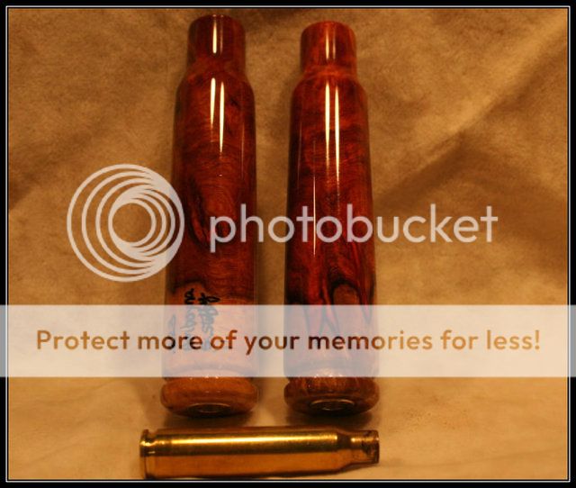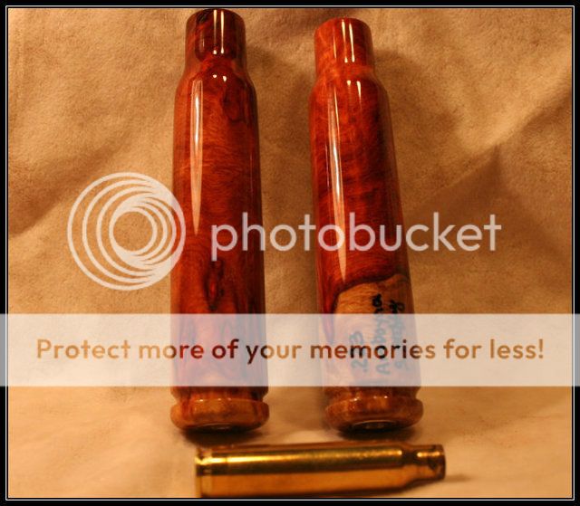 These were ordered by Todd a while back and I just got them finished up. He liked the sound of the one I sent to him in his North Bay Conservation Series Set so much he ordered two more. They'll be on their way to Alaska shortly. They are both scaled (2x) versions of a .223 round in Amboyna burl. Had to get that sapwood in there since I know how much you like sapwood Todd :wink: