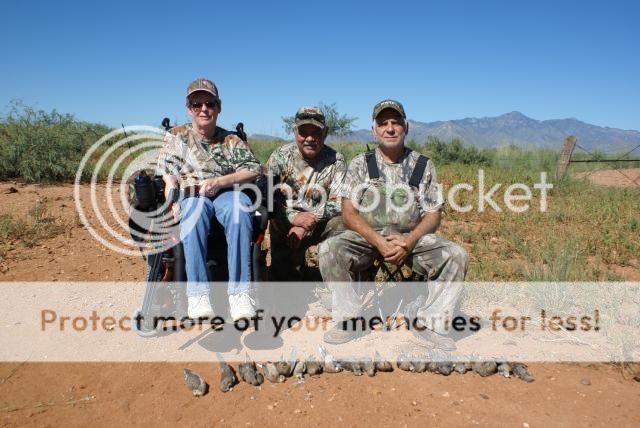 The lady in the wheelchair is using a28ga and got her limit (10) I was using a 20ga and got my limit also.  The guy in the middle is the coordinator of the event.  Wheeling Sportsman in coordination with our local NWTF supplied the transportation, ammo and shotguns(if needed) plus fed us breakfast and lunch.  We set up right on  the border you can see the "border fence" behind us.  The leaning railroad tie is the corner and if you look closely over the ladies right should you can see another "leaning" T-Post.  The mountains in the background are in Mexico.
