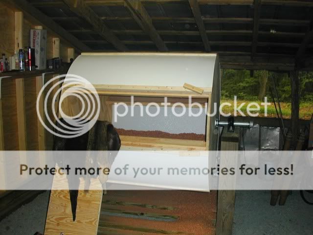 The two circular sides are joined together by 8 baffles. Four of them are 2x4 and 4 are 2x8 [actually two 2x4 as I had a bunch handy]. I ripped 1/2" strips from a 2x4 and screwed through the strips, through the glass, and into the baffles. The sides are 3/4" Plywood and the width including the sides is 48". So the glass lined up with the outside of the sides. Initially I thought I would need to screw all along the sides, but once secured to the baffles it became very solid, so all I did was caulk around it inside and out. The door is simply some ripped down 2x4 sandwiched between pieces of 1/4" plywood and sized to fit between two of the baffles [with a little trim so it sits flat and doesn't fall in.] Still need to upgrade the door hardware, but got impatient. Getting all the belts and pulleys worked out so the drum turns at about 18 rpm off a 1 horse turning at 1725 was an interesting excercise, but after a little tinkering it seems to work well. I ran it for about 8 hrs today and it just purred.