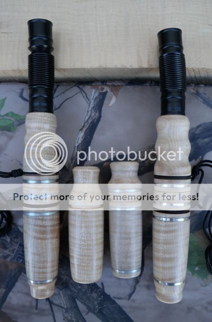 A friend gave me a stick of Curly Maple 2-1/4" x 3-1/4" x 5 foot long the other day.  So I figured I would try and turn a couple calls out of it as a test.  I did these two grunts, and a couple of predator calls. Then tried my hand at inlaying some silver solder bands.  Turned out pretty well.  The Maple has some beautiful figure all the way around.  Thanks for looking!