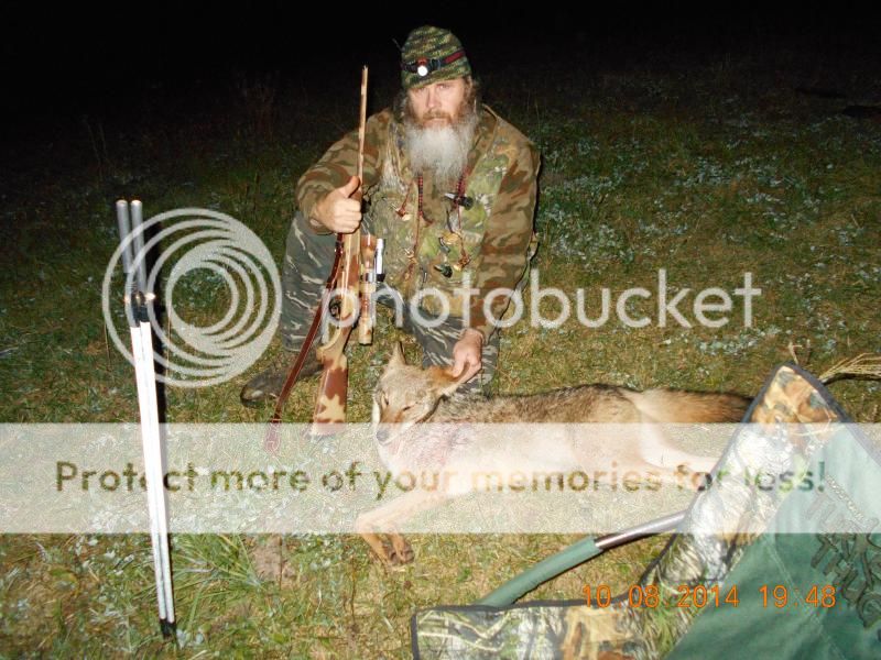 Jon had walked up on this coyote trotting along a fence line about 100 yard in front of him.  He missed the first shot, then started lip squeaking and the coyote turned and came right toward him.  Jon connected with his second shot!  Fur down!!