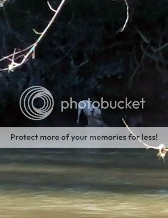 I've been holding off taking my dogs coyote hunting, Dan, my mt cur was IMO to young last year so we just squirrel hunted.  About a week ago I went to a friends farm (40 acre's) to try to call one up. Roi and Dan got their 1st scent of one when we got busted walking in to do a stand. They didn't see the coyote but when they got where his scent was Dan started squalling. (He doesn't bark on coon or squirrel trail, just on tree) They ran the coyote through the woods just under 600 yards and returned. (I wasn't sure why they quit)  Well this morning I was going out to call on some public land. While on the way to where I wanted to call Dan turned loose, Roi even joined in (he normally doesn't tree unless the scent is really hot) I took off to see what they had (tree'd?).   They seemed to hold something for a few min's and run again. (rough on this old fat boy) I'm not sure how far we went but they finally held still... I'm guessing they had bayed ol wiley up against the river so he decided to swim across.  They had him bayed up against the bank on the other side (river is up too)  I shot him with my 22 mag (only thing legal on WMA's), I guess that turned the frenzy of escape loose in him.  Roi (BMC) tied into him and got cut up a little but the coyote got shook pretty hard lol.  No hero shot of the coyote, I wasn't swimming lol here's a cell phone pic of Roi (BMC) and Dan on the right over the coyote in the river, pic is zoomed in and cropped, it was about a 50 yard swim for them..