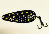 Wthhhhhhhhhhh.....The black one with yellow spots mimics a tiger salamander which is a favorite food of bass, pike and pickerel,and walley up here. The red one mimics a red breasted sunfish, also a favorite food of the aforementioned fish.  I use colors that work, and still in my opinion the best spoon for all those species is the plain old daredevil red and white spoon!