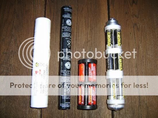AND HERE A PICTURE OF THE BATTERY STICKS AND CARRIERS FROM LEFT: The 6 volts battery stick of the Magcharger, the skinny 6 volts  battery stick of the Ultra Stinger, the plastic carrier for the six 123's batteries of the Surefire M-6 and last the aluminum and Delryn 12 volts carrier of the Borealis 1050 lumens flashlight.