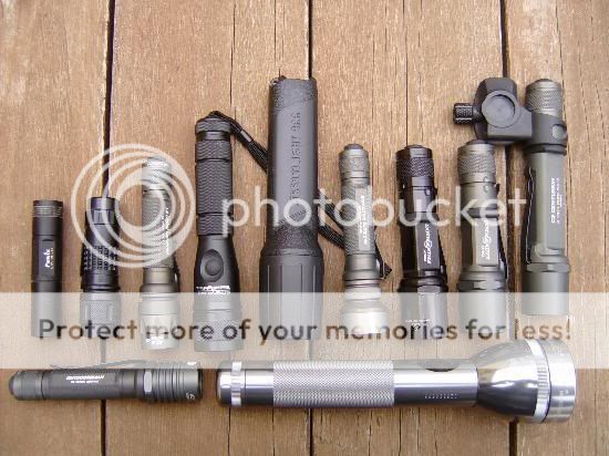 HERE IS A PICTURE OF THE LIGHTS, FROM LEFT TO RIGHT:  Maglite 3 D,  Magcharger, Ultra Stinger, Surefire M-6 Guardian, and Borealis.