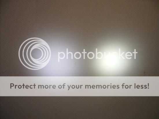 And here is a picture of the beam shot against the ceiling at a distance of 6 feet, the one on left is the Jet Beam I MK IIX