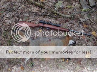 So I have been feeling a little under the weather lately with a cold. Slept in to about noon today and had nothing to do for the rest of the day. I decided to try my hand at some fox hunting. Well I grabbed the .17 HMR and headed for a small wood lot with a pond and a swamp that is behind my parents house.  Snuck into the woods to where I knew a deer stand was that over looked a thick swampy area. I put the W.T. caller down, sprayed some fox pee at the base of the tree and climbed up. I started to play the Young fox whines sound and in less than three minutes here comes a fox!!!!  I wasn't even ready, it walked right under me and right up to the E-caller. As I was about to take aim, it walked off using the thick brush as cover. It went back into the swamp and barked while moving. It circles me about 7-10 times before I shot it. It would come out to my right, get behing me and go back in to my left always using the same path. Finally as I could predict its travel path I decided on where I was gonna shoot it. SO, on its next circle around I waited until it got in a clear spot and I pulled the trigger, CLICK......  Nothing the round never went off. That happens sometimes with my .17.  CRAP!!!!  I was thinking to myself. I cycled another round as quiet as I could and waited until it came around again. Next try, here it comes BANG. Got it!!!!!!  knocked it right off its feet. It went about 10 feet before it layed down and died. I am pretty proud of myself because I had to shoot it left handed and behind me.