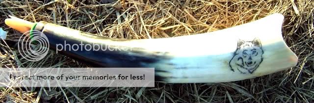The wolf has a big  voice, and that means a big horn.  This howler is just over 12" long, with three inch width across front of horn. Here is a close up of the scrimshawed wolf.