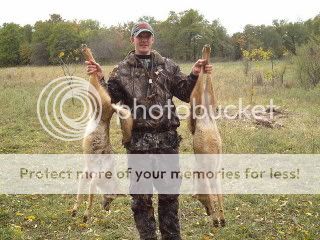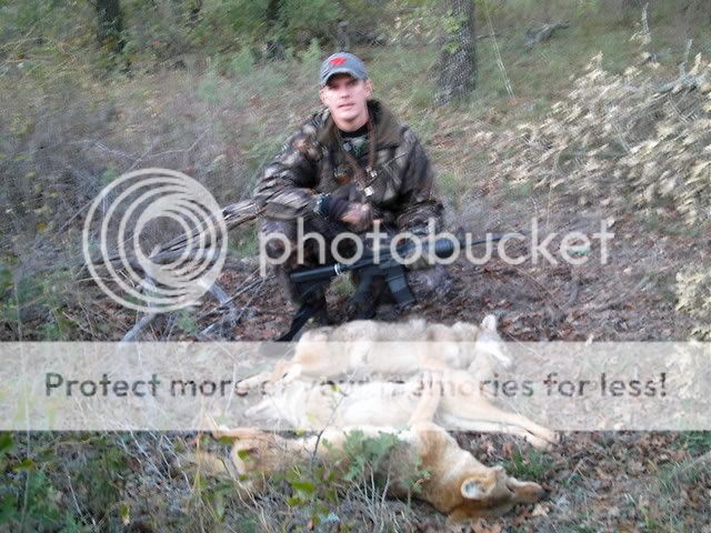 I got to go out and do a little bit of hunting with my dad. We went out and made three stands. The first stand was in a pecan bottom that has thick woods on three sides, and  a small creek running through the middle of it.  Dad and I sat up along the tree line against the creek and called out into the small pecan bottom. After two series with one of my open reed medium-high pitch calls. I noticed two coyotes running in from the east.  I told dad and he spun the camera around on them and I waited until he was on them. I whistled and the first one stopped. I put her down at about 125 yds.  Looked up and didn't see the other one run off, but I didn't see it .   I was looking hard and still couldn't find it, as i was fumbling through my calls to get a call that will do a good coyote distress, when I looked up and there she was about 135 yds out, standing up and looking around like what the heck just happened, and where in the heck is my buddy?   I lip squeaked to her and she looked at me and turned broadside. bang flop.. About 10 feet away from coyote #1.