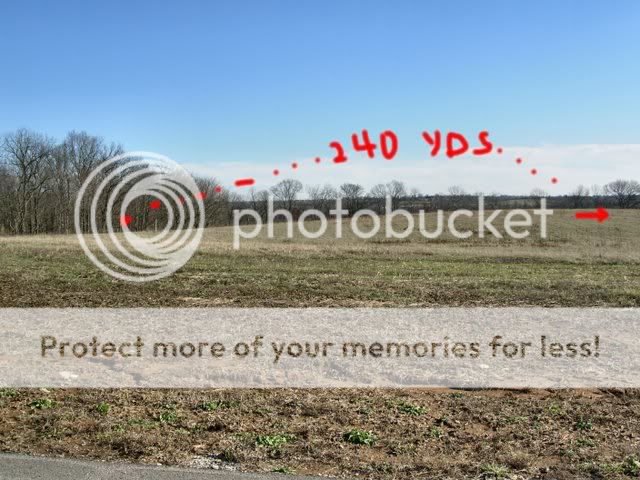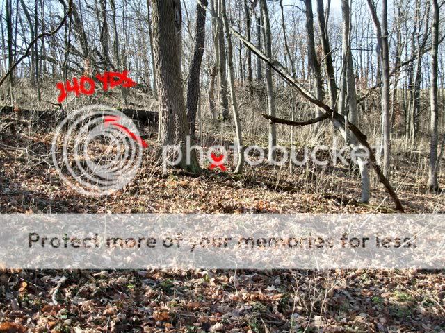 The weather has been rainy and windy all week, with today being the first chance I have had to do any field testing on the new Fury. My buddy, Chuck, and I went out for about an hour this afternoon and tried a bunch of setup scenarios to test the remote functions. I have taken some pictures that I feel demonstrate clearly how dependable the remote is under trying circumstances. We ran other setups too, but these clearly show that normal setups will be a piece of cake for the caller.  The first picture shows the first test. Chuck put the Fury on the ground behind the big trees you see in the picture, with weeds and briars all around, 306 yards from the caller to me.  All features worked without a hitch including the ten presets.  Then Chuck took the Fury into the wooded area shown in the second picture, and sat it on the ground behind a big oak, 40 yds. from the field. It was very uphill from where he sat the Fury to the open field.  I went across the field 200 yds to the other side of a dividing ridge, as you can see in the picture a total of 240 yds from the Fury to me.  Again, all features worked flawlessly. We ran other setups at varying ranges in varying degrees of cover, and again, all features worked flawlessly.  More tests next time out. Here are the pictures: