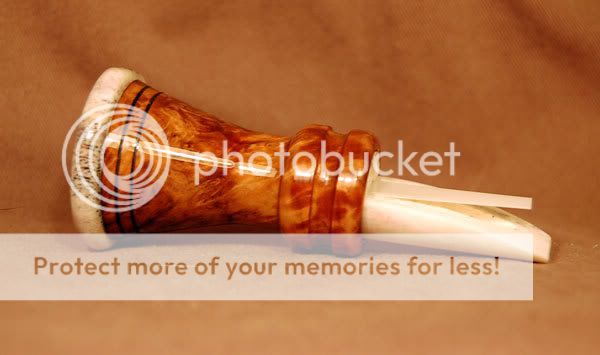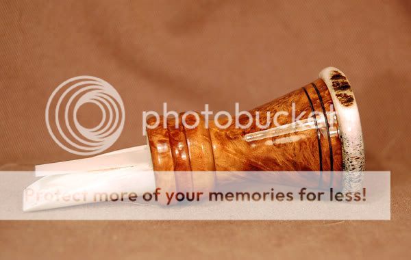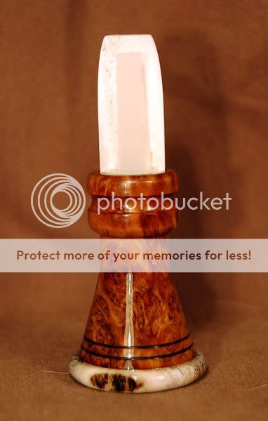 :roflmao:  :roflmao:  :roflmao: Thought I'd glued myself to the lathe again didn't ya! I made this one with the intentions of selling it....I just can't seem to let go of it. I can tell by looking at it, it wants me to take it hunting. The barrel is a piece of Brown Mallee Burl with an Elk Antler bead. The tone board is an o-ring fitted piece of Mule deer antler. Sounds sweeeeet!  I think it's my new baby! Heck I think the yotes will come running just to get a look!  :biggrin: Let me know what you think!