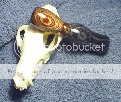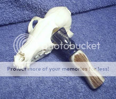 Dymondwood mouth piece and a piece of stained elk antler. 2 pics same call.