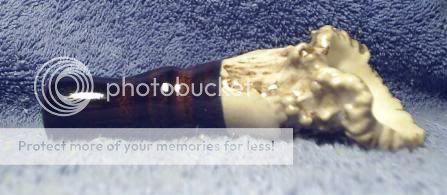 The mouth piece is a piece of chair wood. No idea what it is. whitetail antler base.