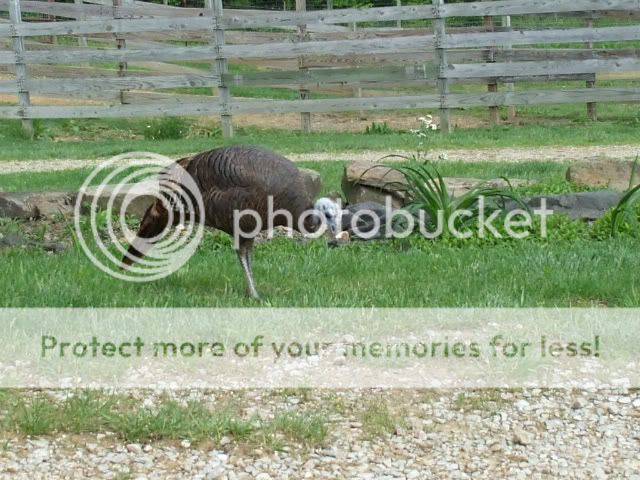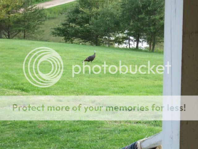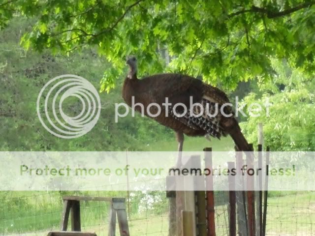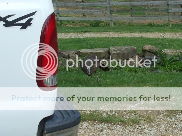Monday when we arrived home after having carpel tunnel surgery on my left hand there was a hen turkey standing by the gate . During the day monday it walked in to the front yard and since then has made it's self right at home. I can walk up to about 8 feet then it gets nervous. I hope she hangs around or has her nest close because it is interesting to listen to her.